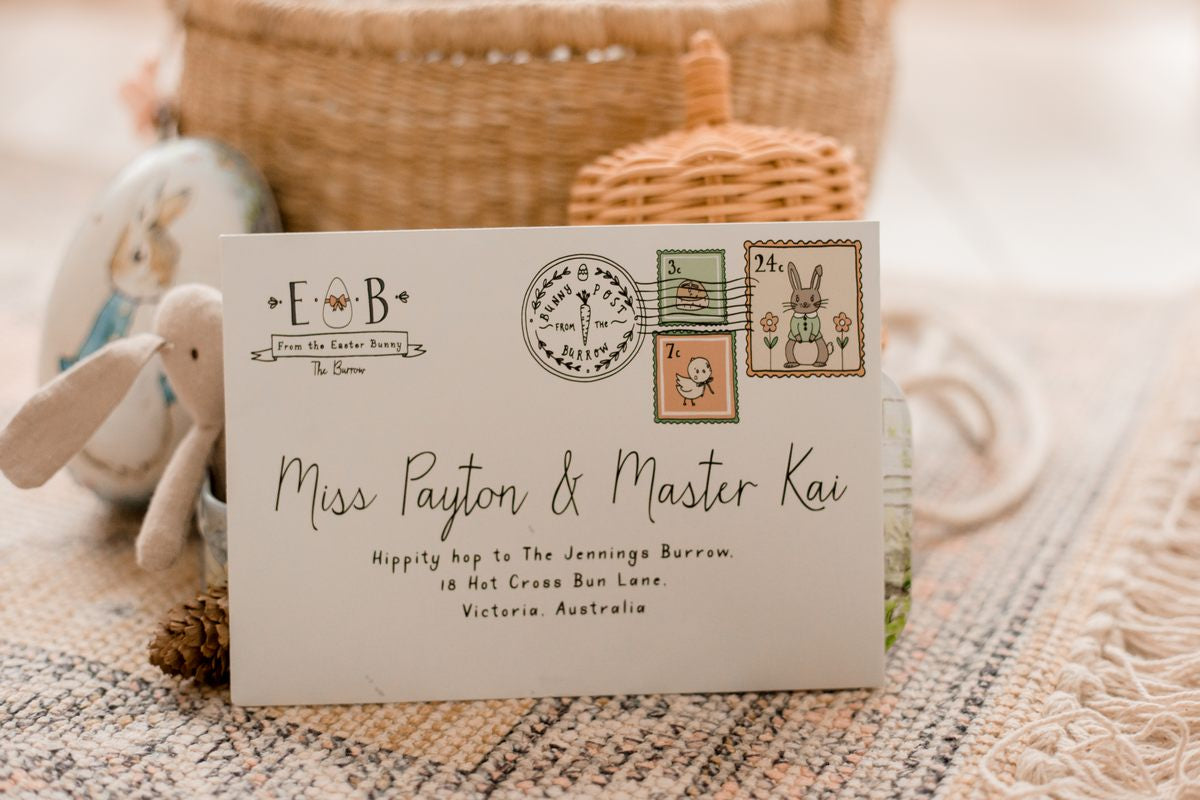 – The sage green envelope includes your child’s name and address (supplied by you) and the official Easter Bunny logo and stamps.