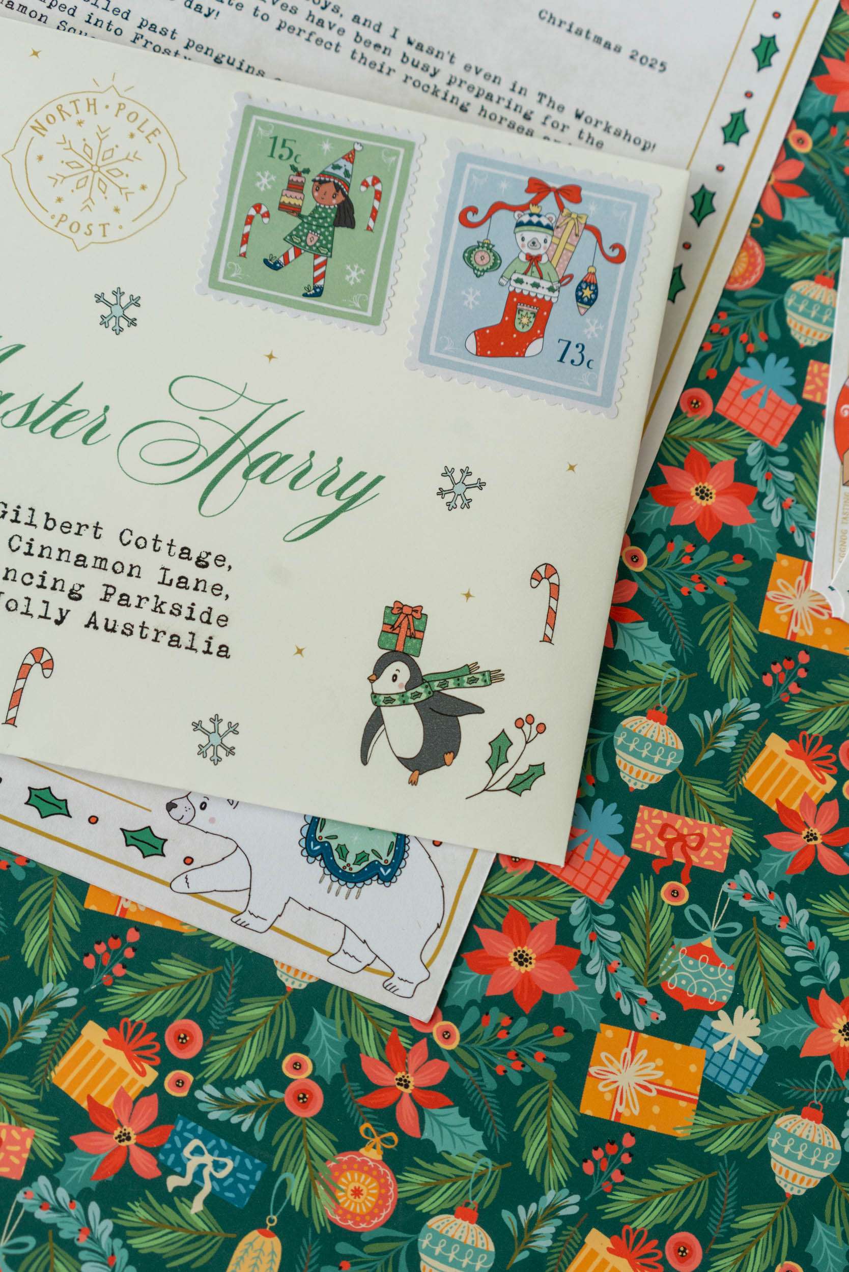 - The envelope includes your child’s name and address (supplied by you) and the official North Pole Post logo and stamps.