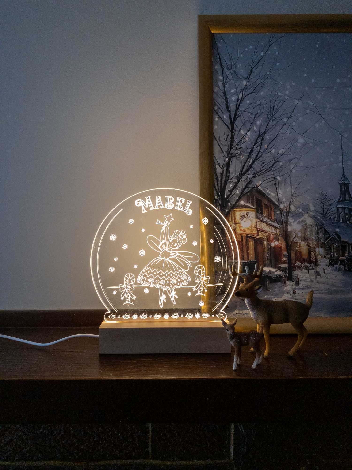 Pop this magical Christmas snow globe night light on your little ones beside table or in your festive display this Advent! This beautiful night light is etched with your little ones name onto 4.5mm clear acrylic and sits in a birch base with a LED lighting strip.