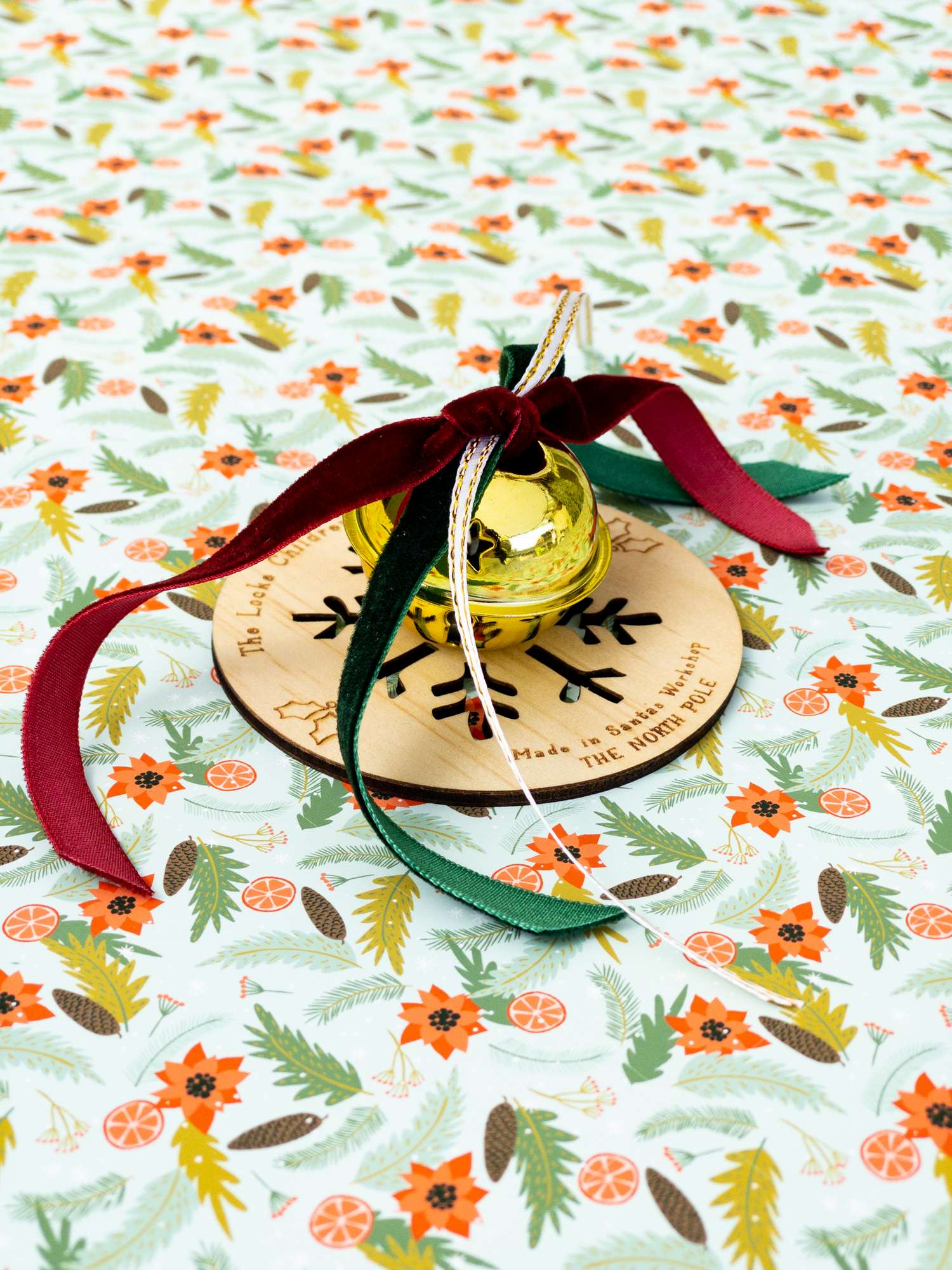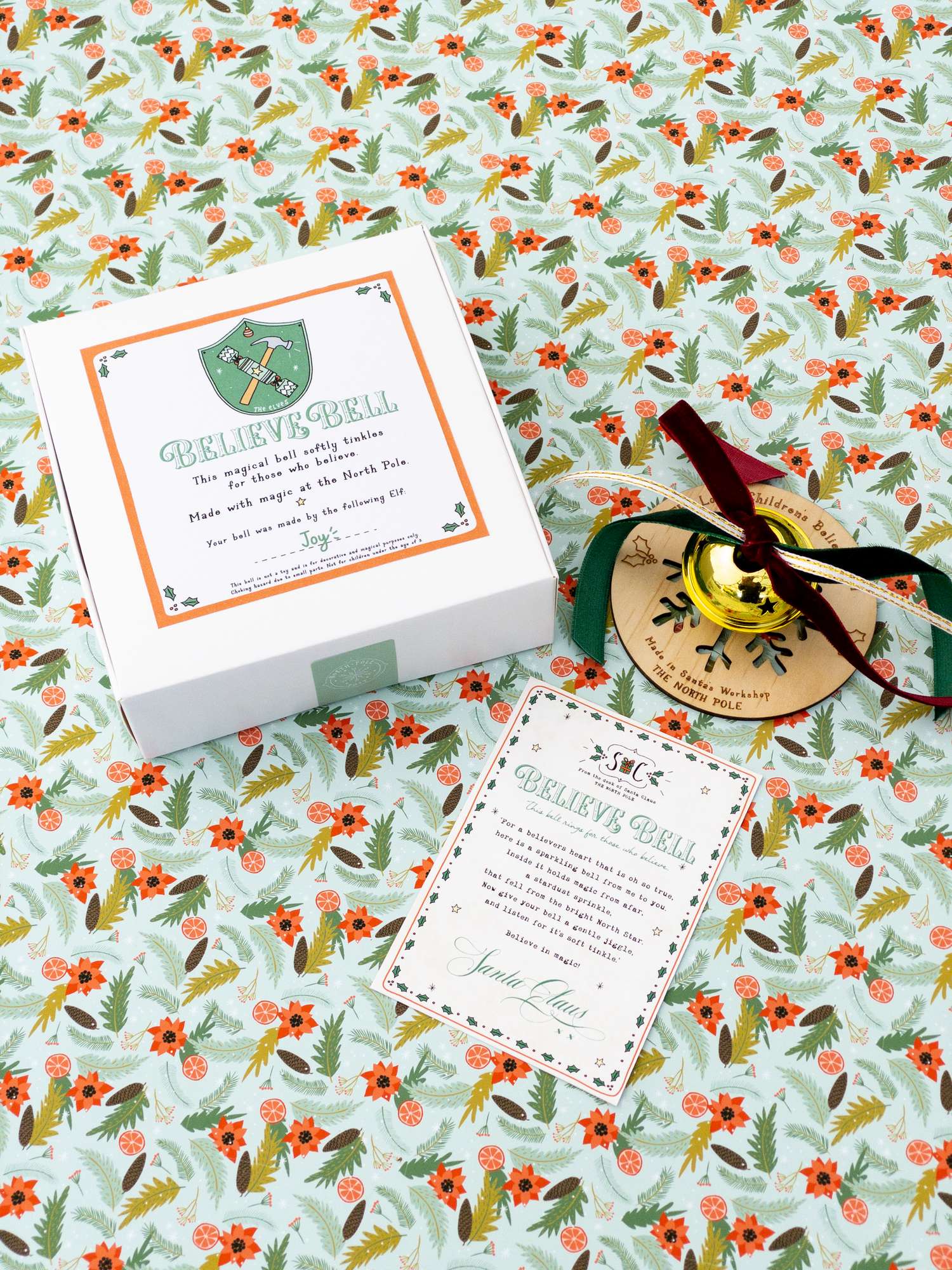 A sparkling gold believe bell that rings for your little believers! The bell sits on a personalised snowflake disc (there is a hole cut out so it can sit nicely) and is adorned with velvet ribbons. Magical!