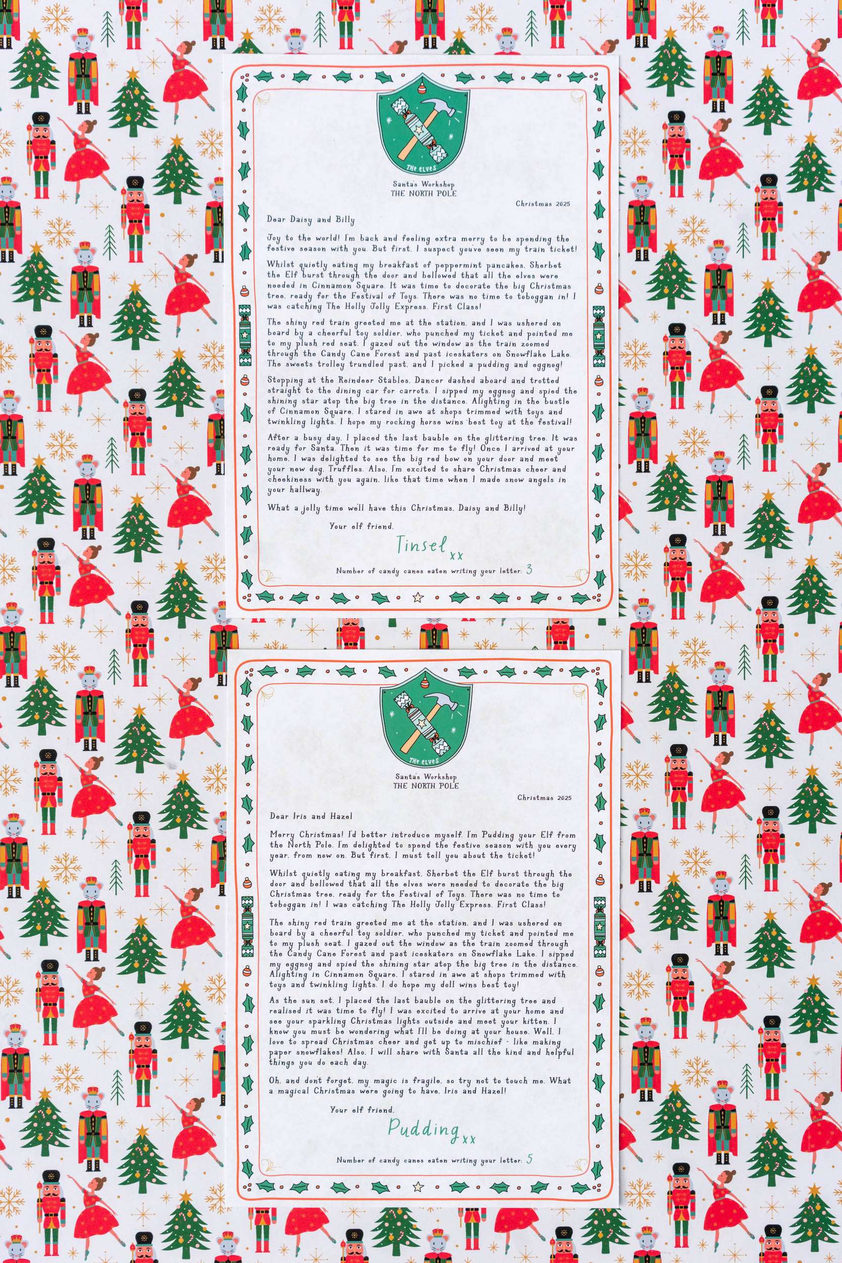 In this year's Elf Letter, your Elf writes about their train trip into Cinnamon Square on the Holly Jolly Express, and if you choose 'my elf's first Christmas' letter they'll also introduce themselves. The letter can also be from two elves. Please note, some photos show previous year's Elf letters.