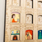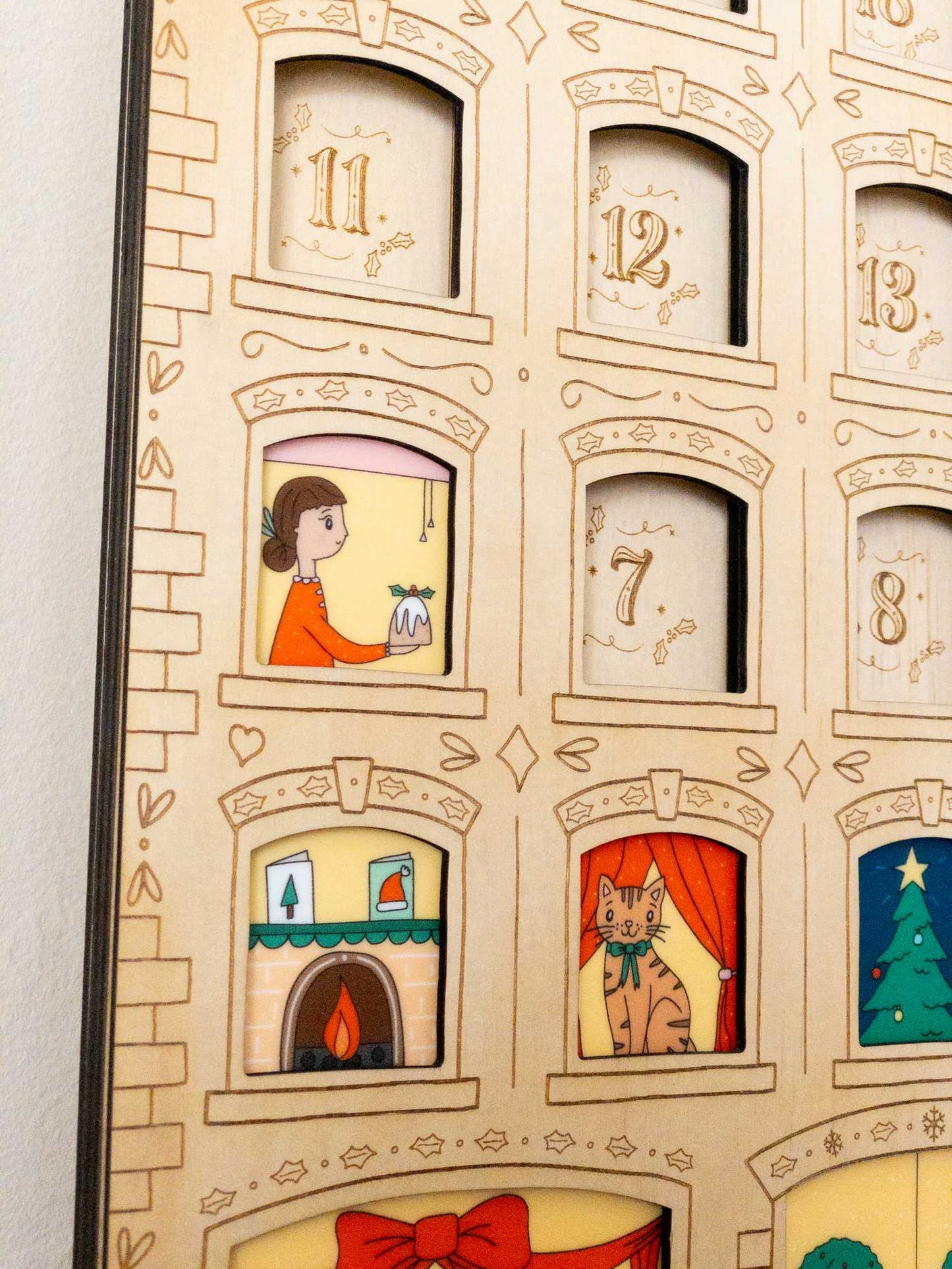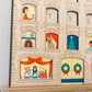 - 24 illustrated windows scenes that slide into the apartment block printed on 6mm white acrylic