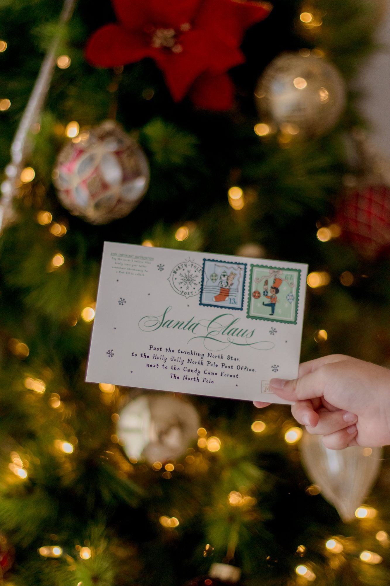 - The envelope includes the address and official North Pole Post logo and stamps.