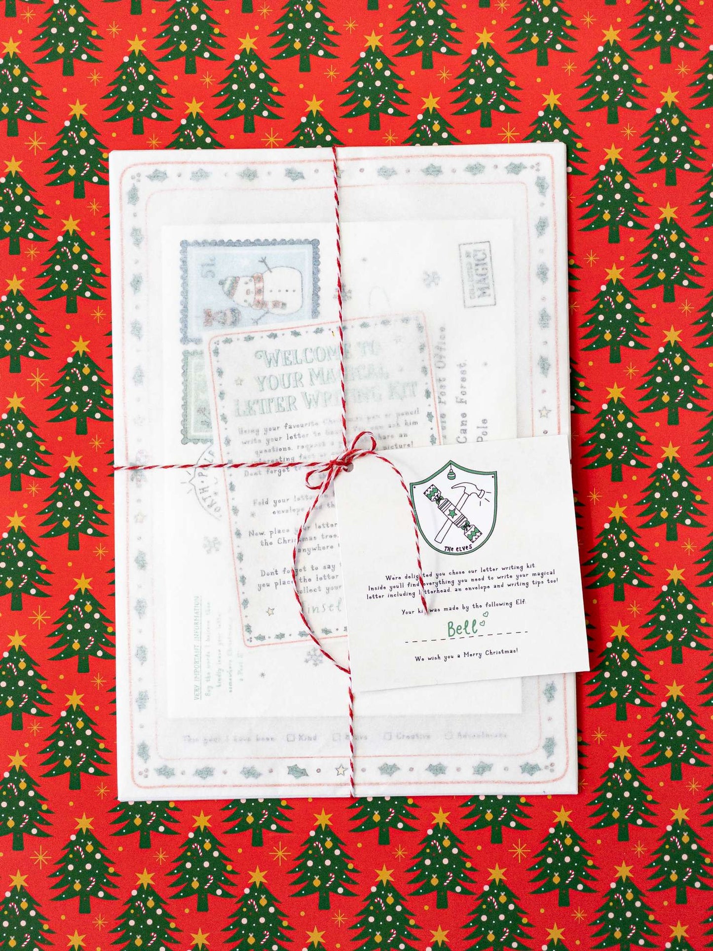 Each letter writing kit comes wrapped in tissue paper and tied up with red and white bakers twine.
