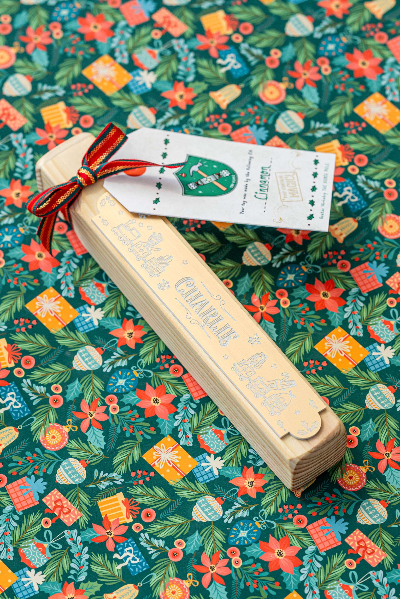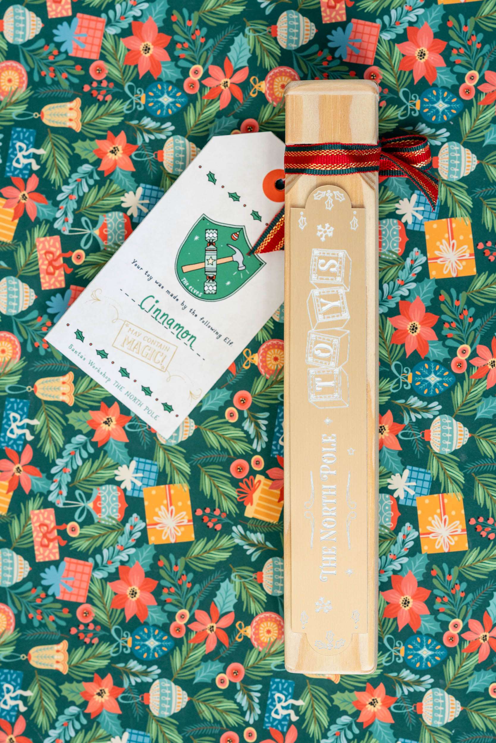 Add a personalised terrific train whistle to your child's stocking this Christmas morning! Adorned with glittering gold illustrated details, your child's name and the North Pole Toys seal. The whistle comes tied with a festive ribbon and a tag with the name of the elf who made it. Magic!
