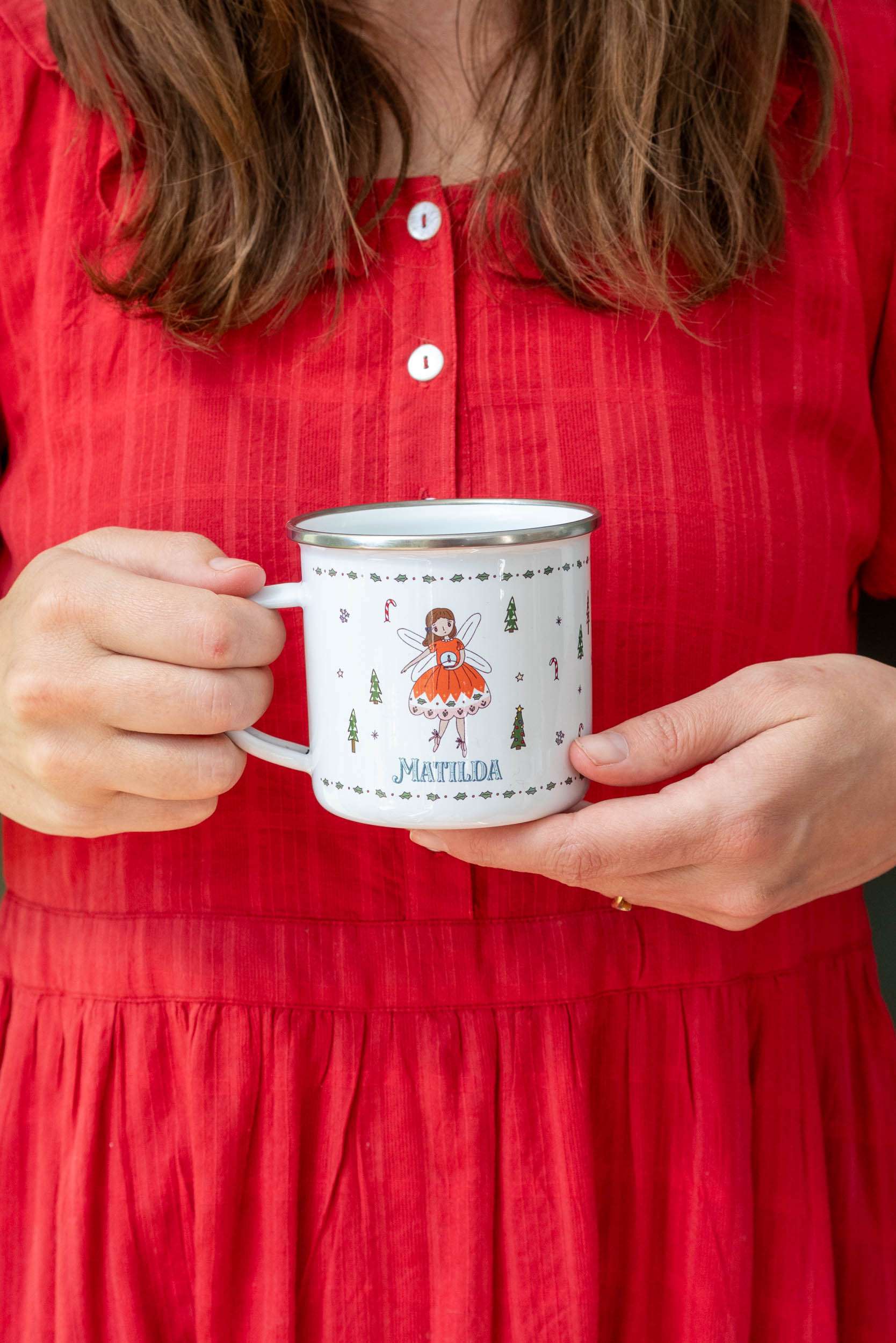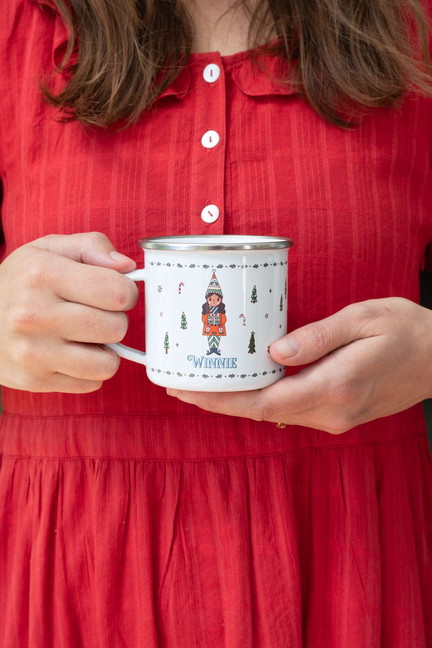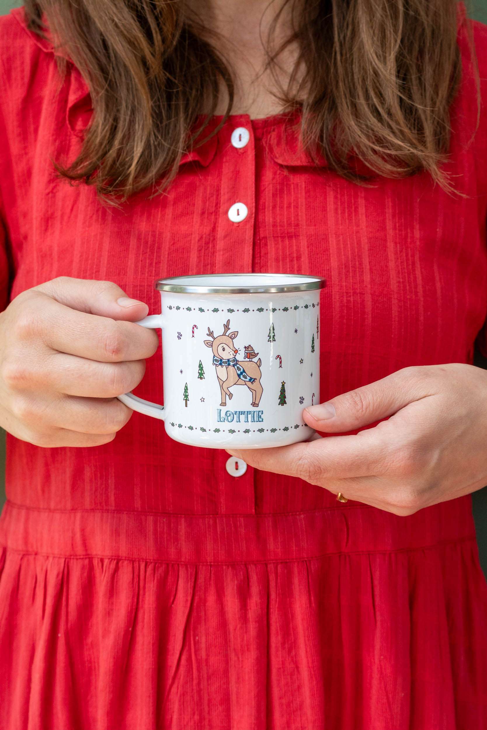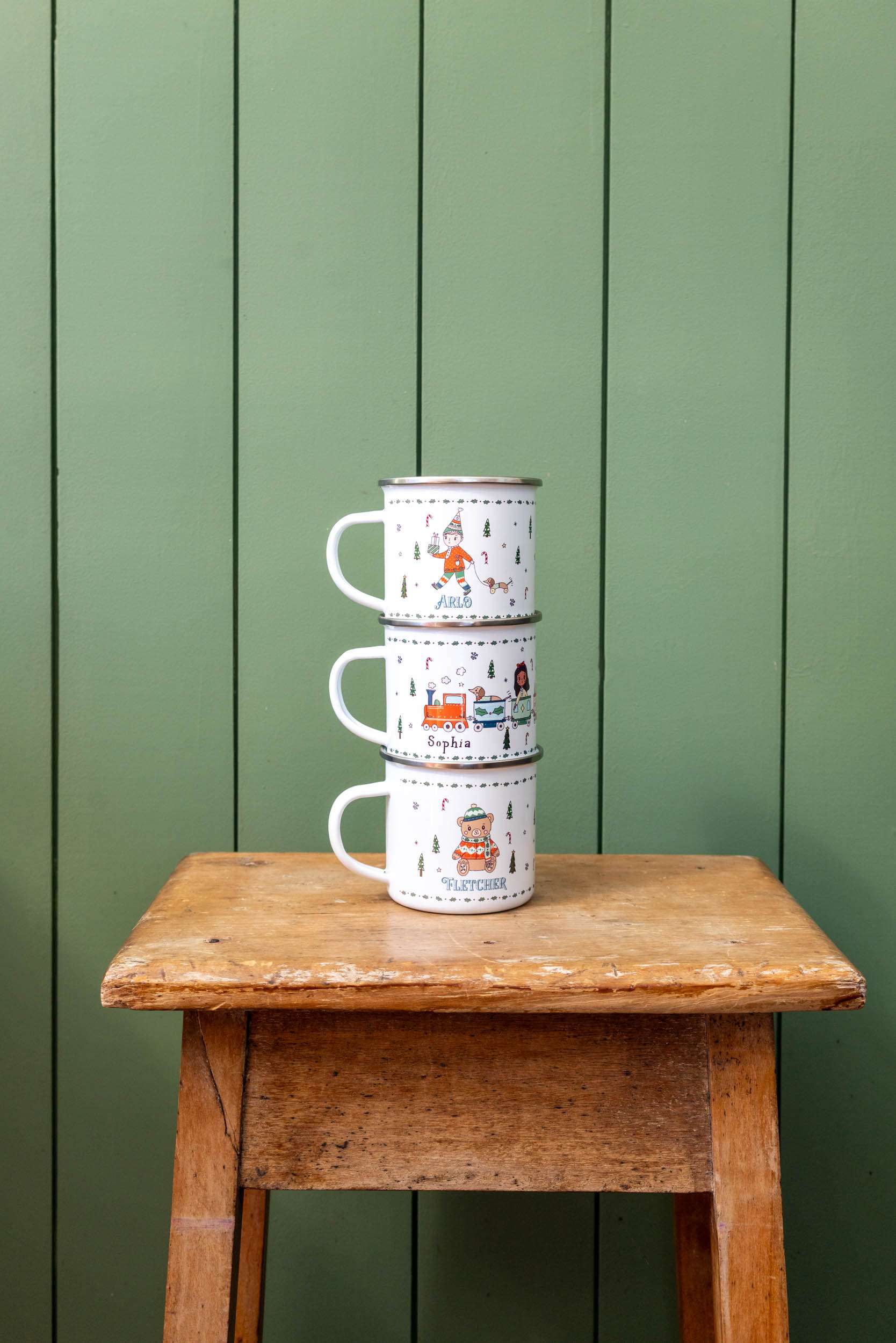 Imagine your little one sipping a hot chocolate from their personalised Christmas mug! You can choose from 20 different characters, plus the holly border wrap and trees wrap all the way around the enamel mug.