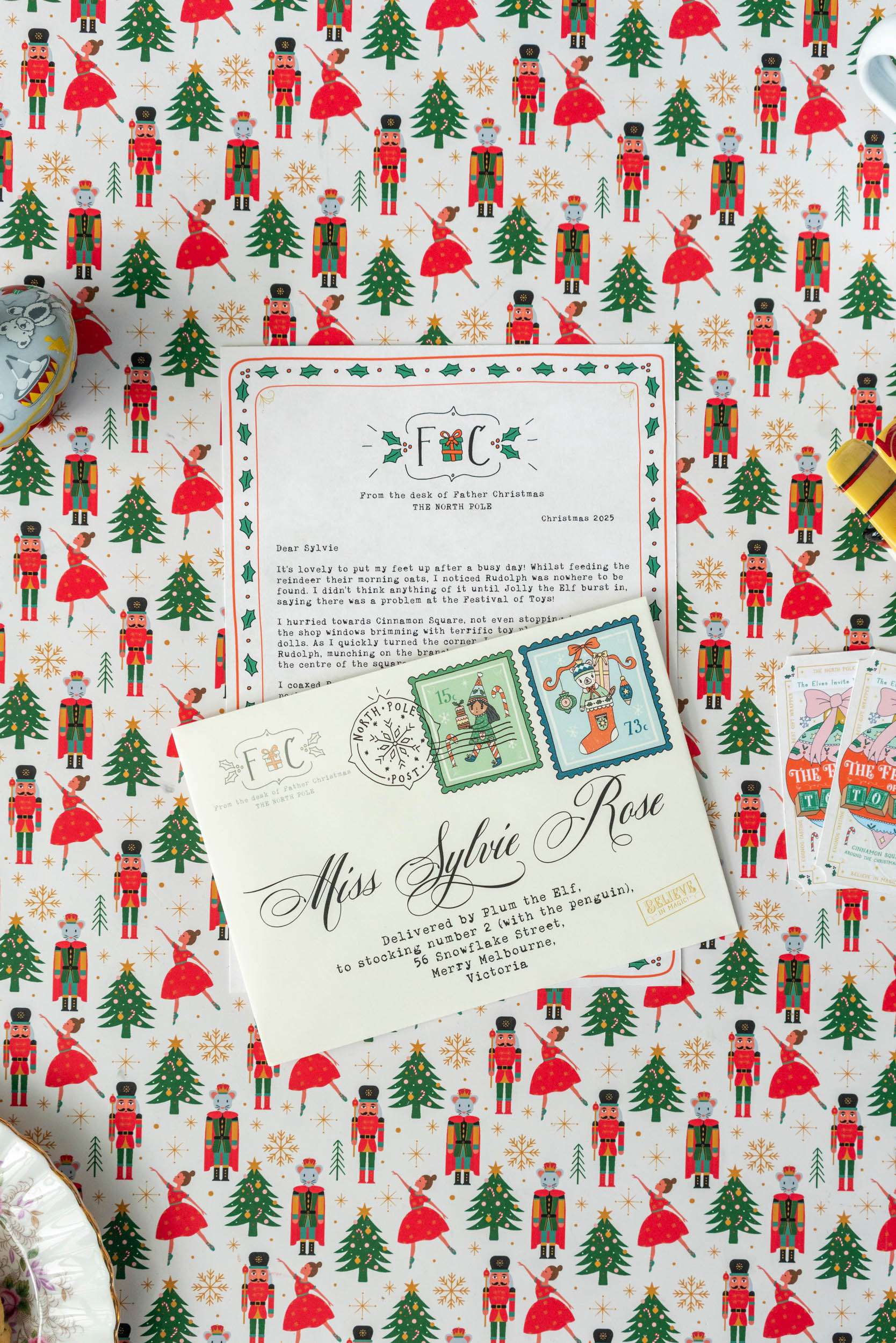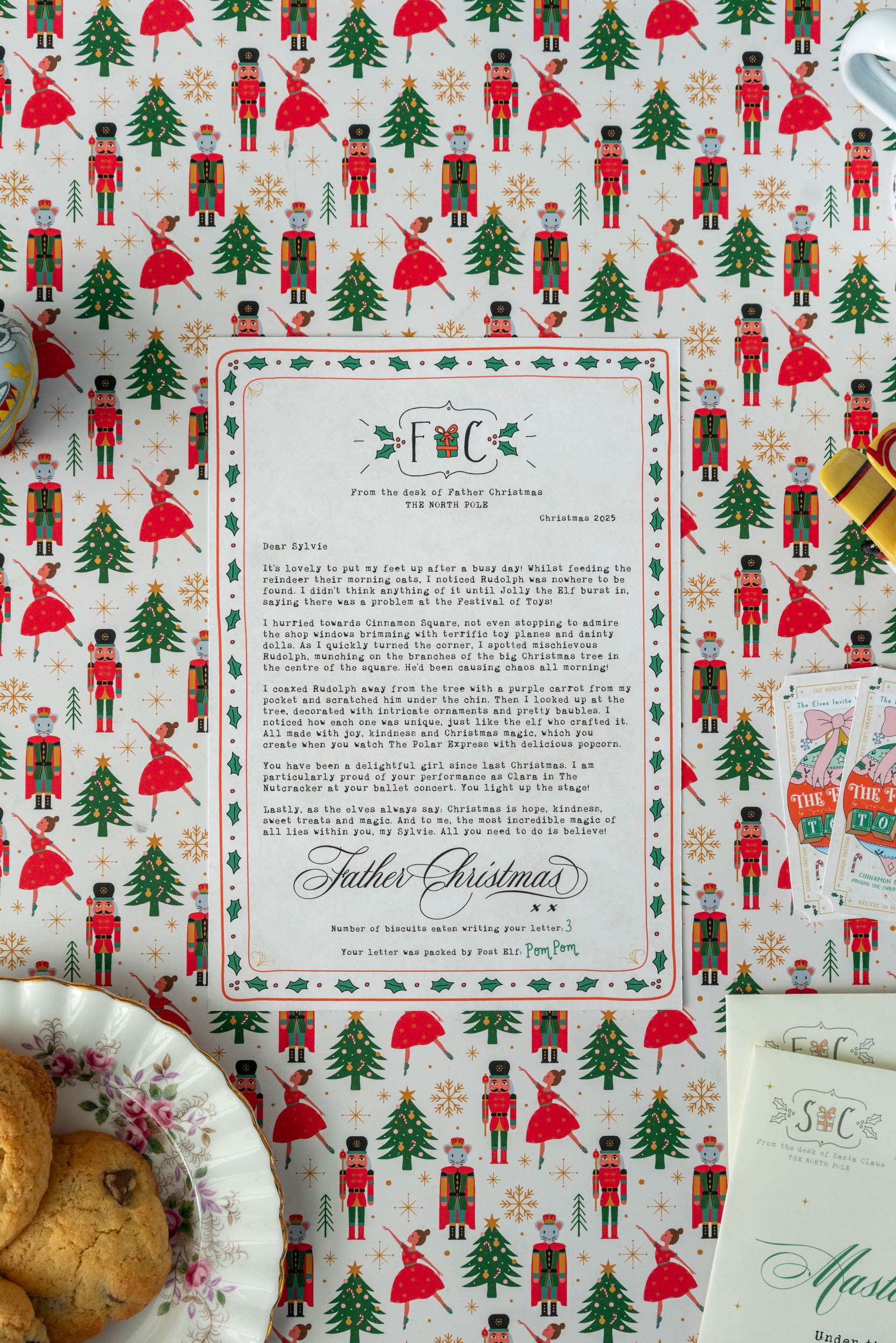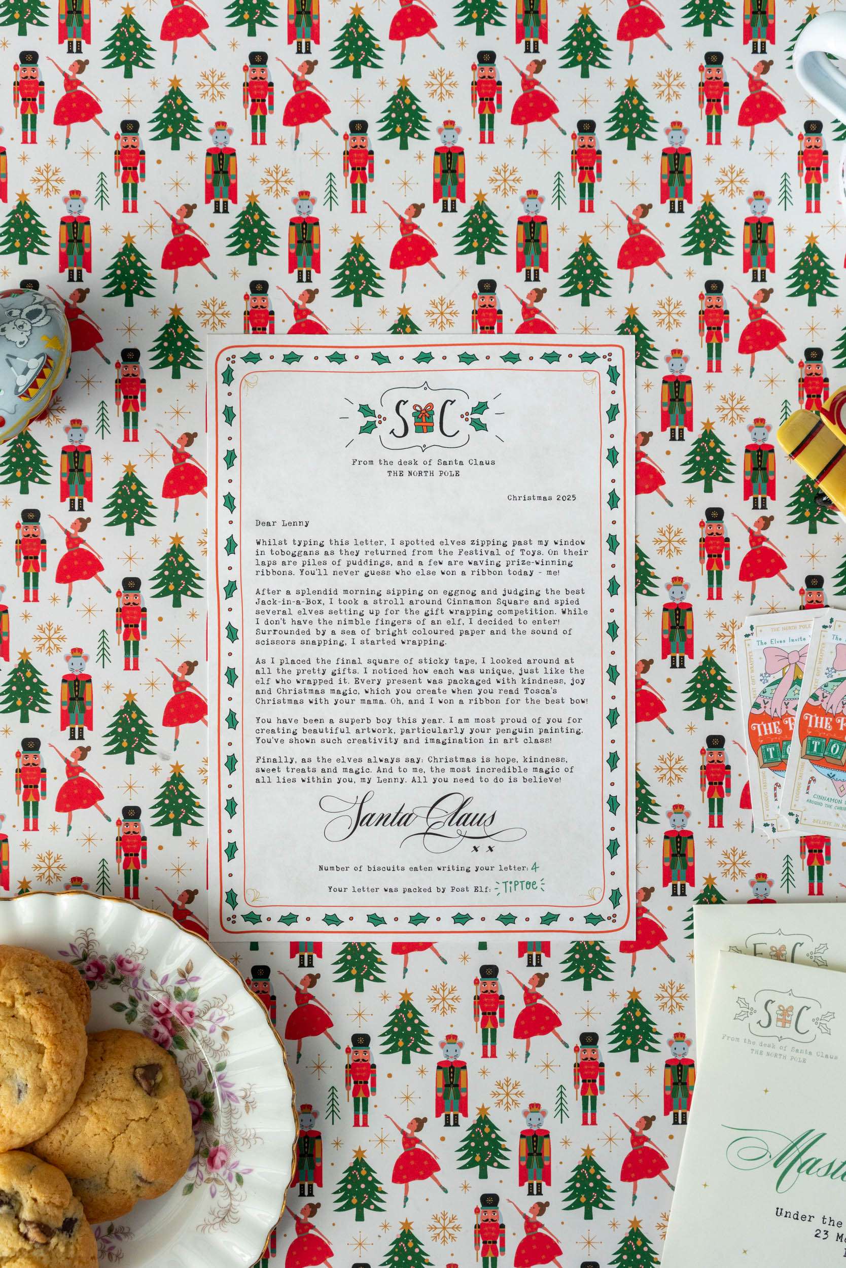 In this year's personalised letter from Santa, he writes in letter one about Rudolph causing chaos in Cinnamon Square at the Festival of Toys and in letter two about entering the gift wrapping competition at the festival. Also, some photos may show previous year's custom Santa letter images.