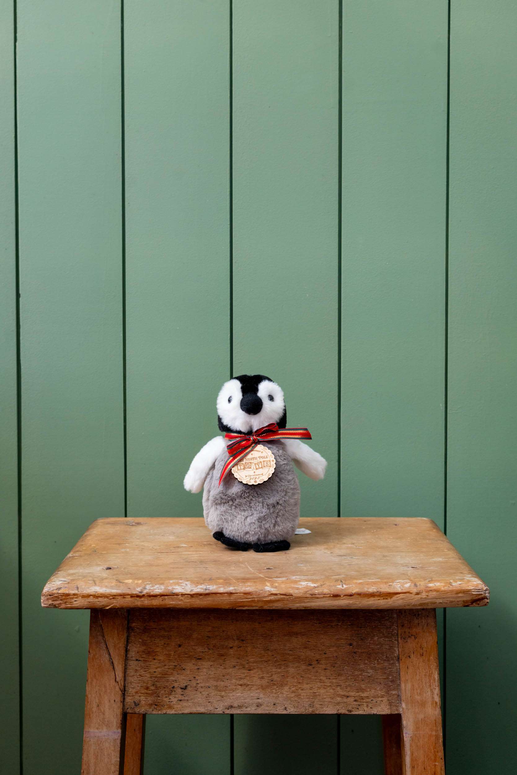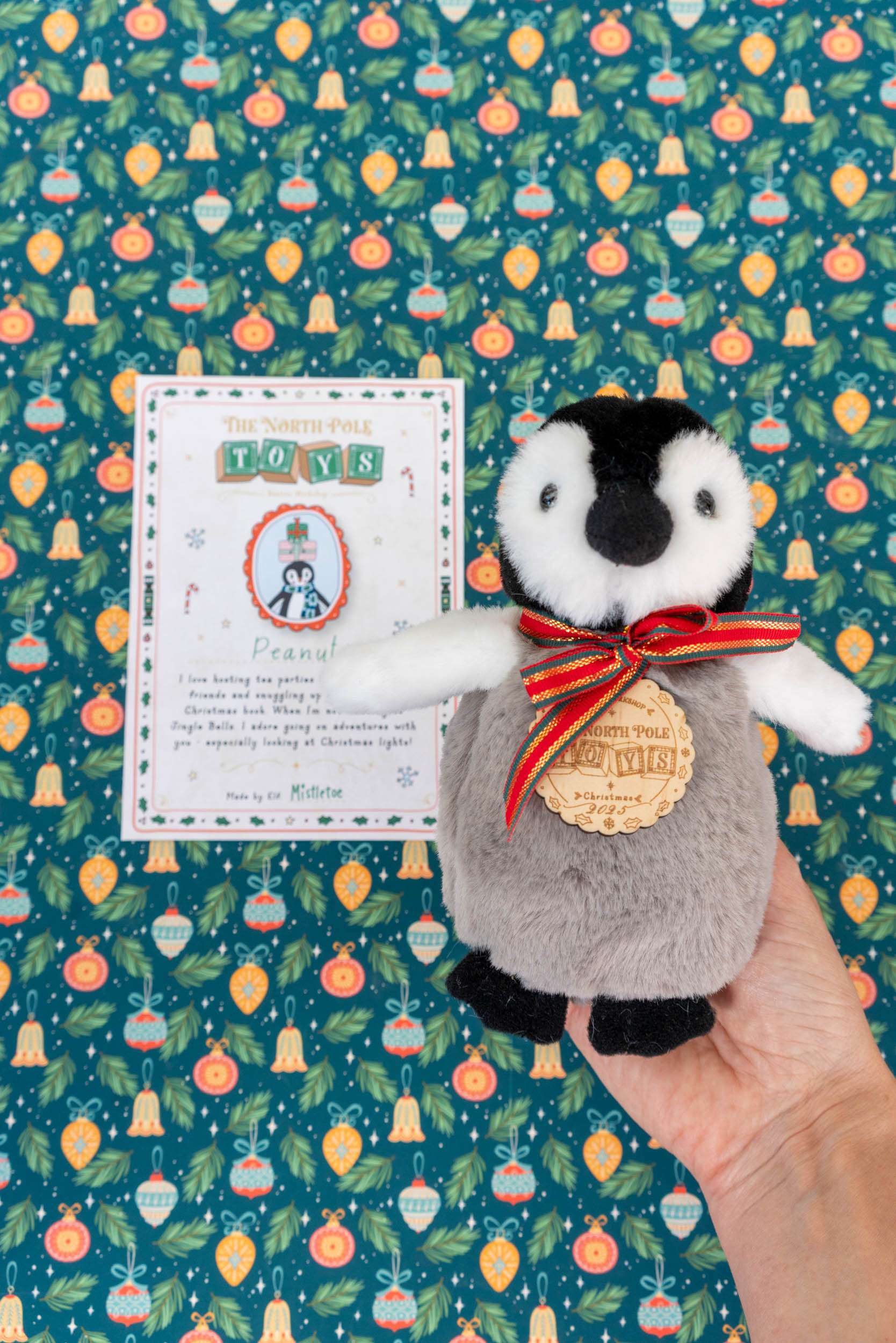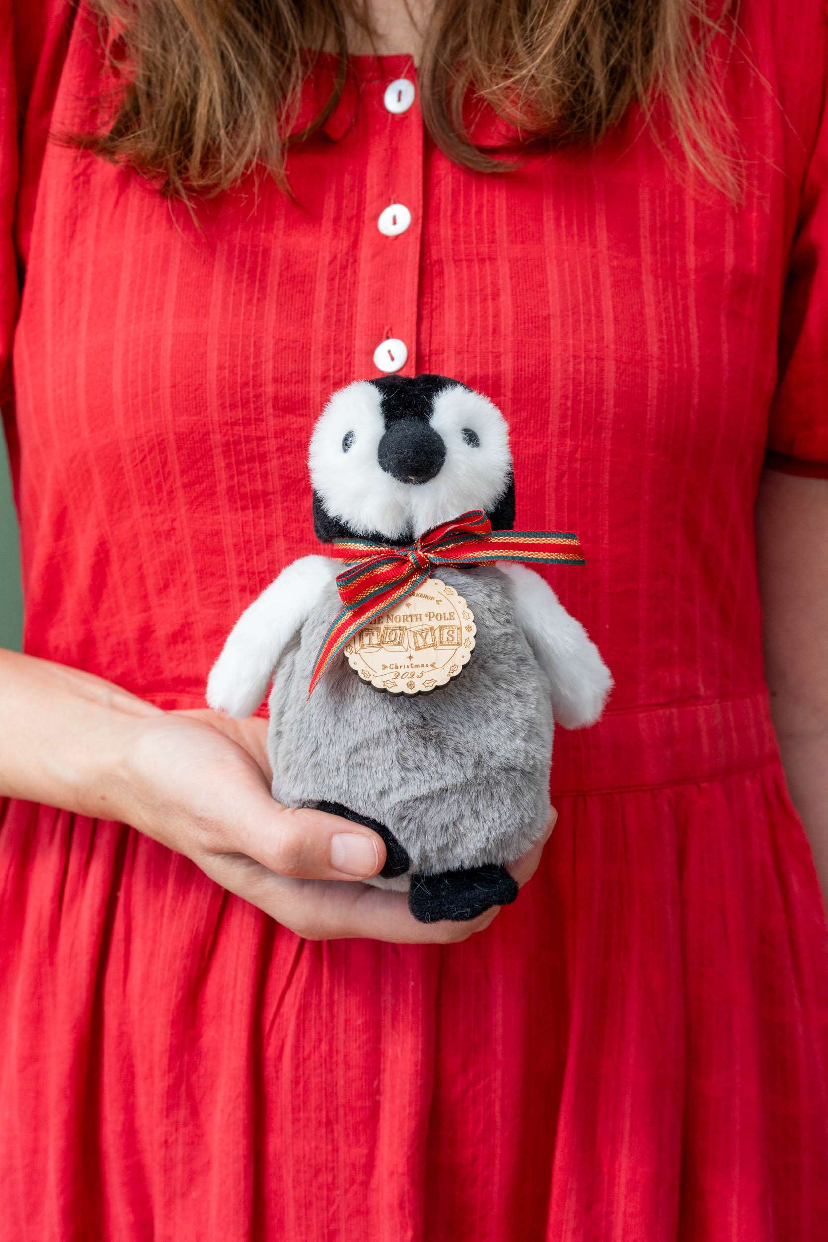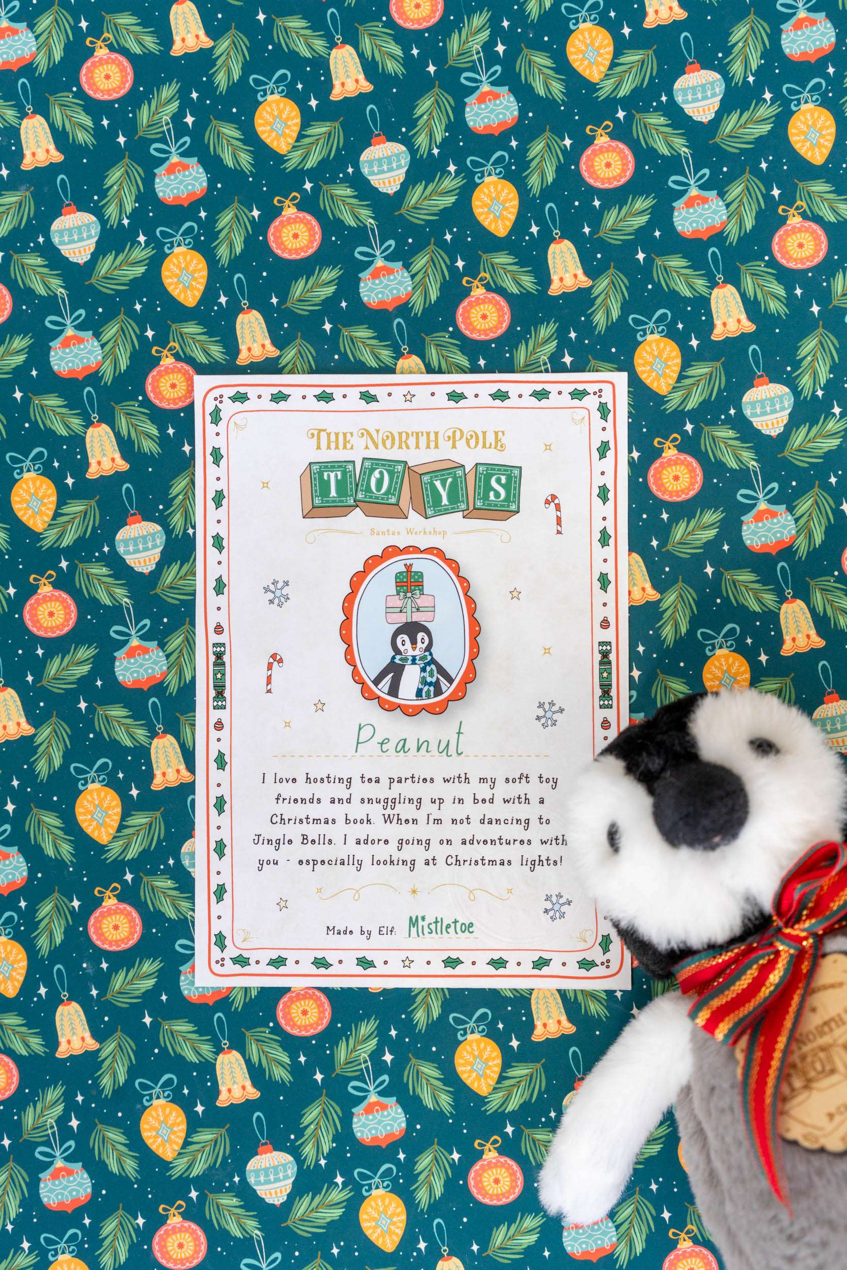 Can you imagine your child discovering this adorable plush penguin toy made in Santa's Workshop, tucked under the tree this Christmas morning? This 15cm soft toy penguin comes with a festive ribbon, a wooden North Pole toys tag and an A6 adoption card with the name of the Elf who made it.