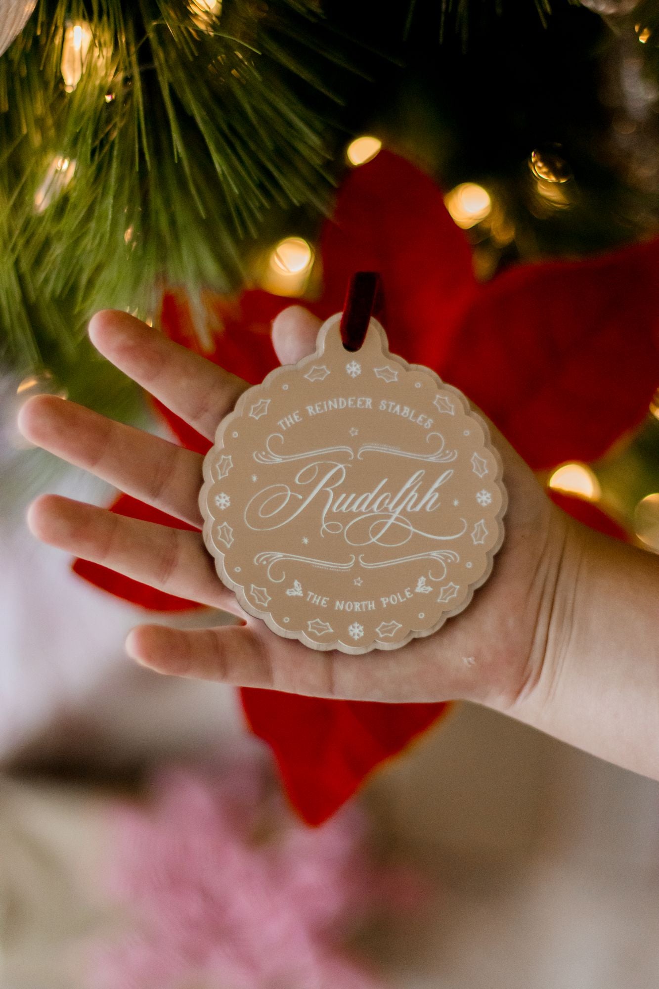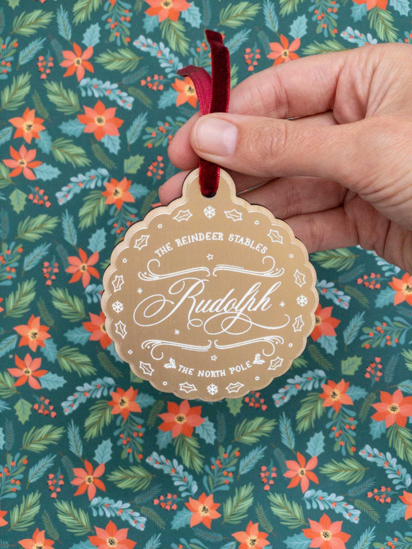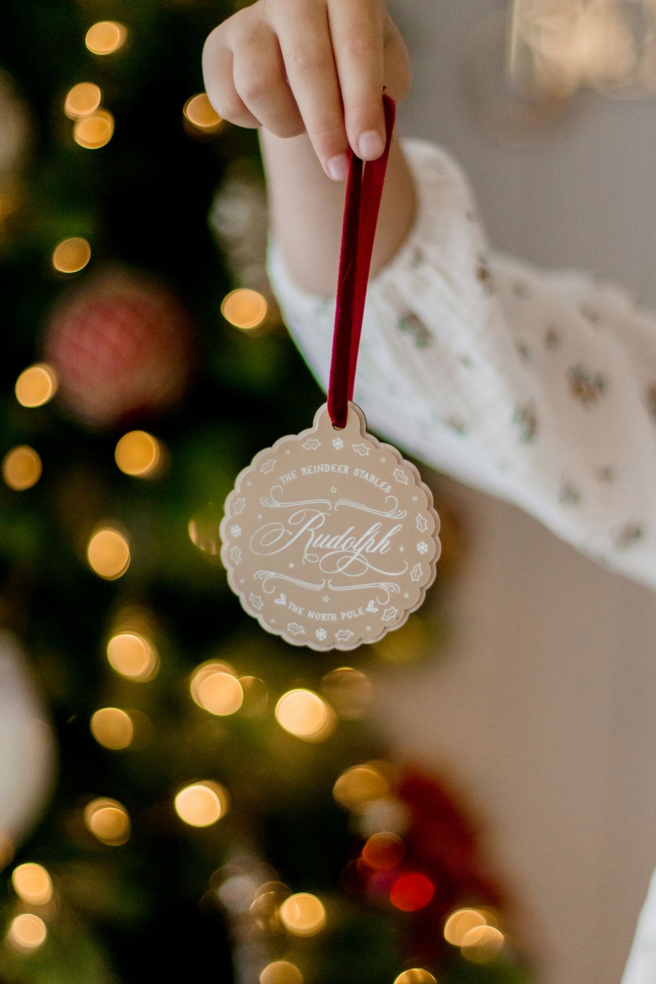 Can you imagine your little ones discovering Rudolph's glittering lost name tag on Christmas morning? What a delight! This glittering gold tag is etched with Rudolph's name and comes with a length of beautiful velvet ribbon - like it slid off when the sleigh drew to a halt at your home!