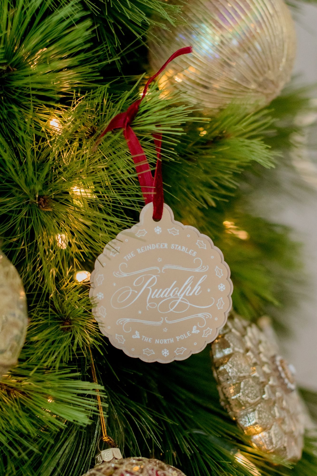 – Glittering gold acrylic, etched with Prancer's name, The Reindeer Stables and The North Pole and attached at a FSC pine