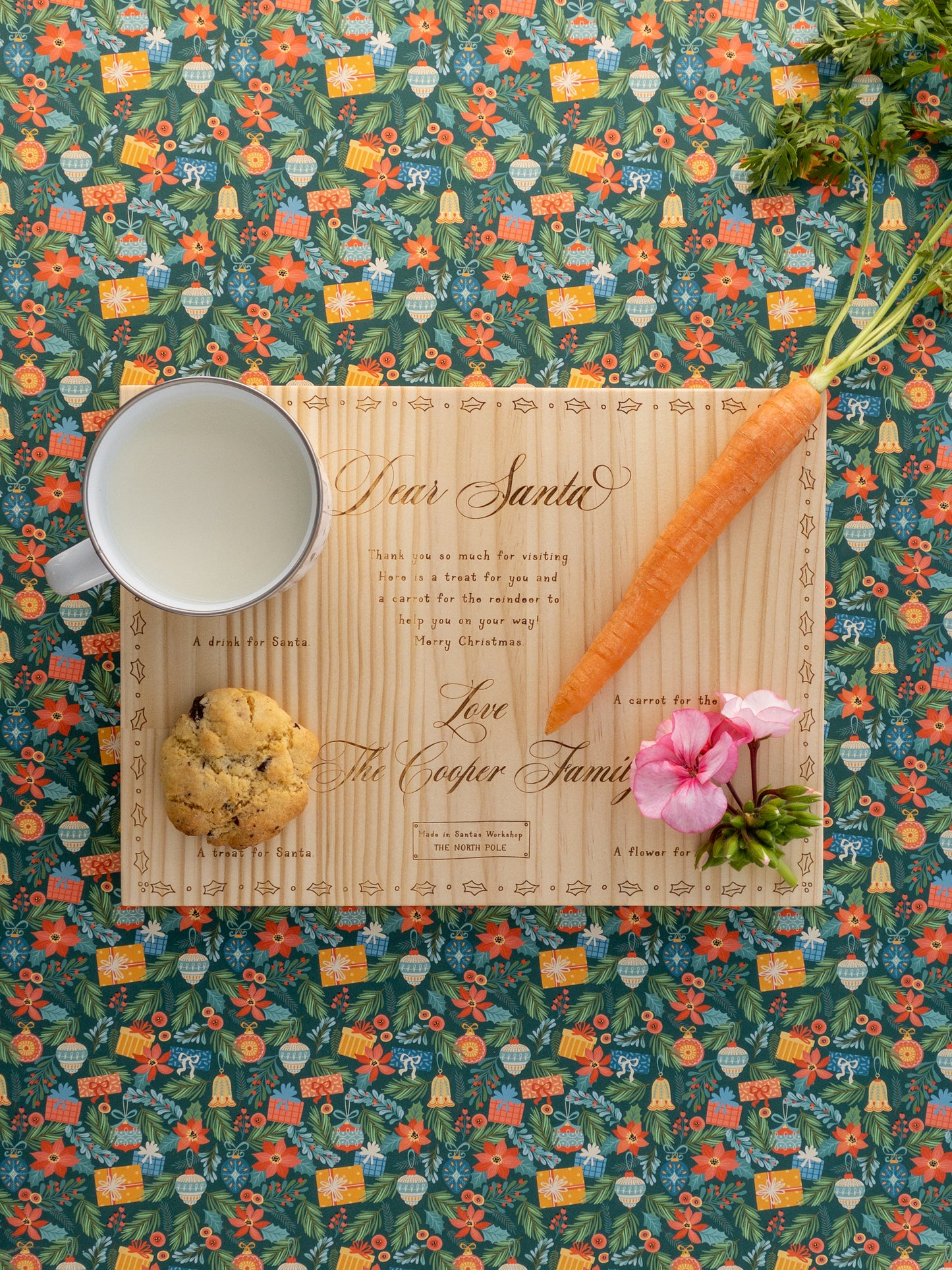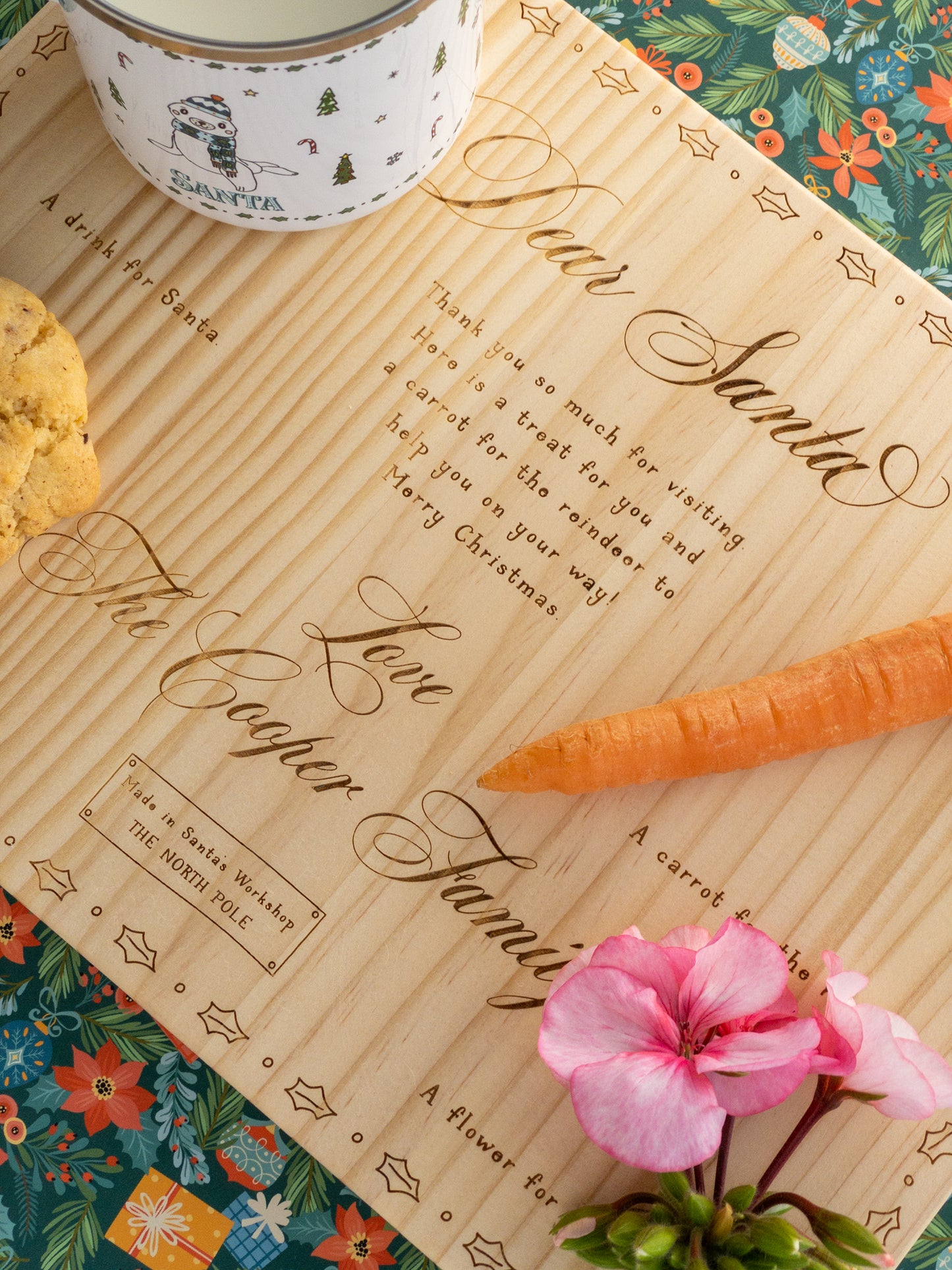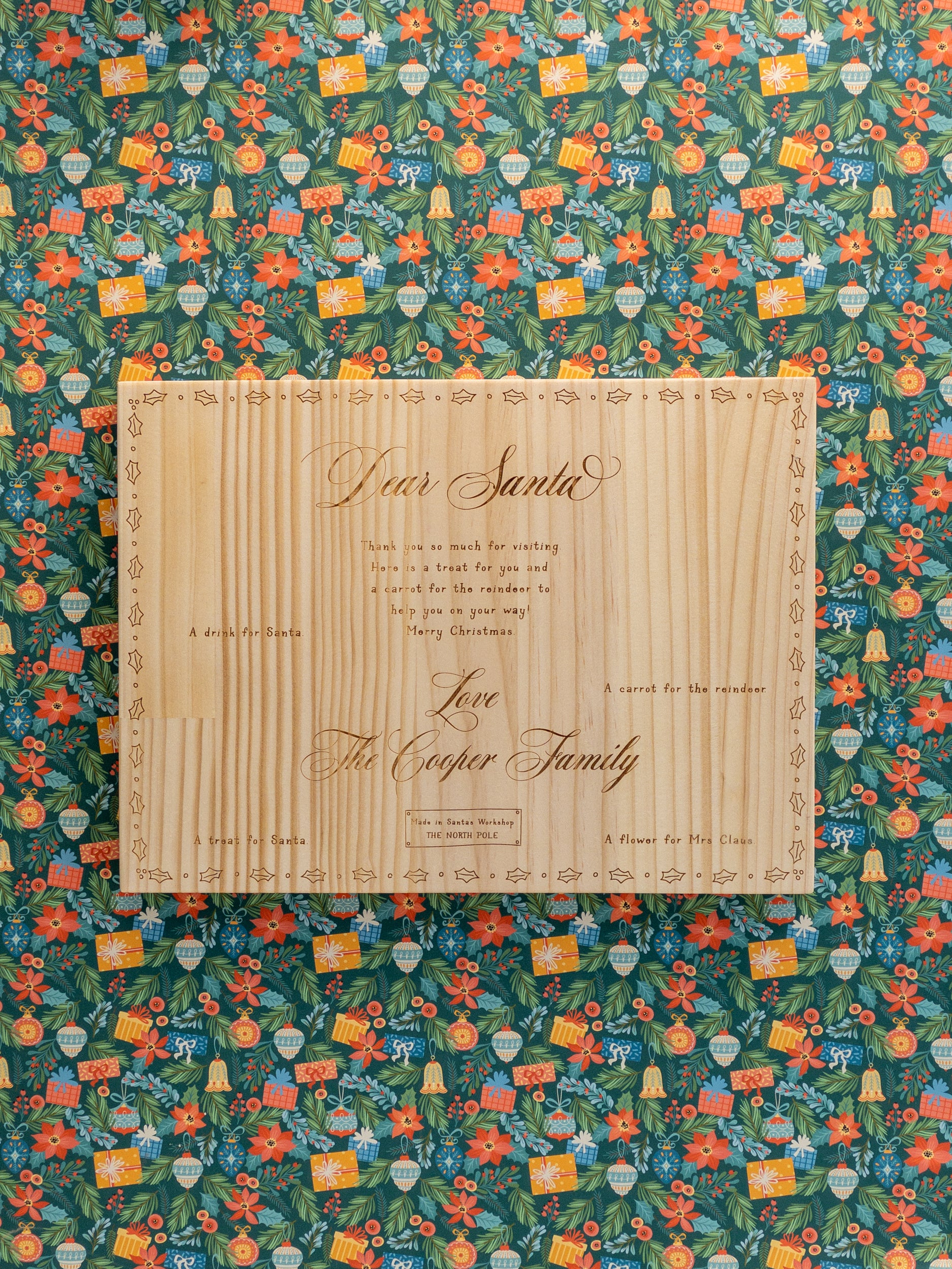 The perfect Santa board to place treats for the reindeer, flower for Mrs Claus and Santa himself on Christmas Eve. This Santa board is made from FSC pine and is personalised with your child or family name. You can also choose your board with the details on where to place items, or with just the message.