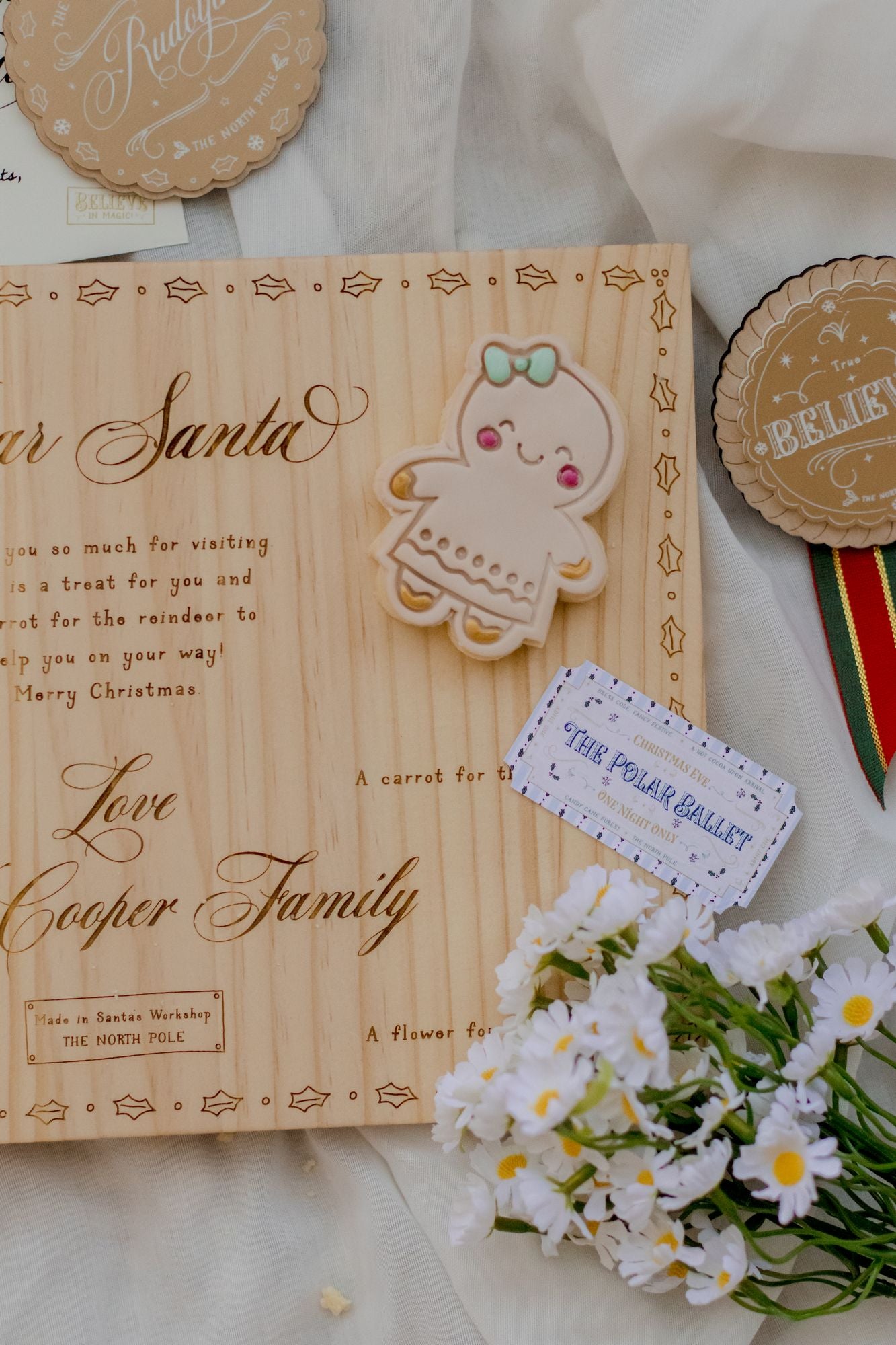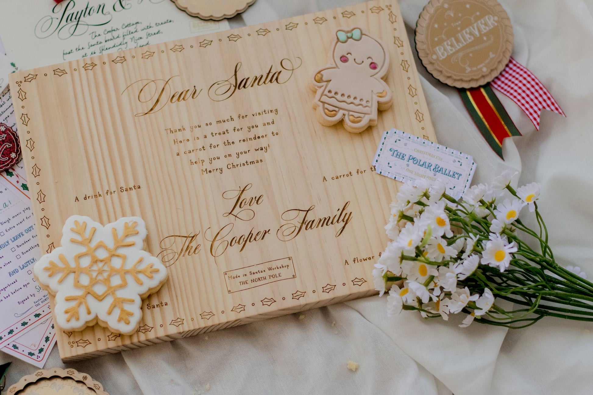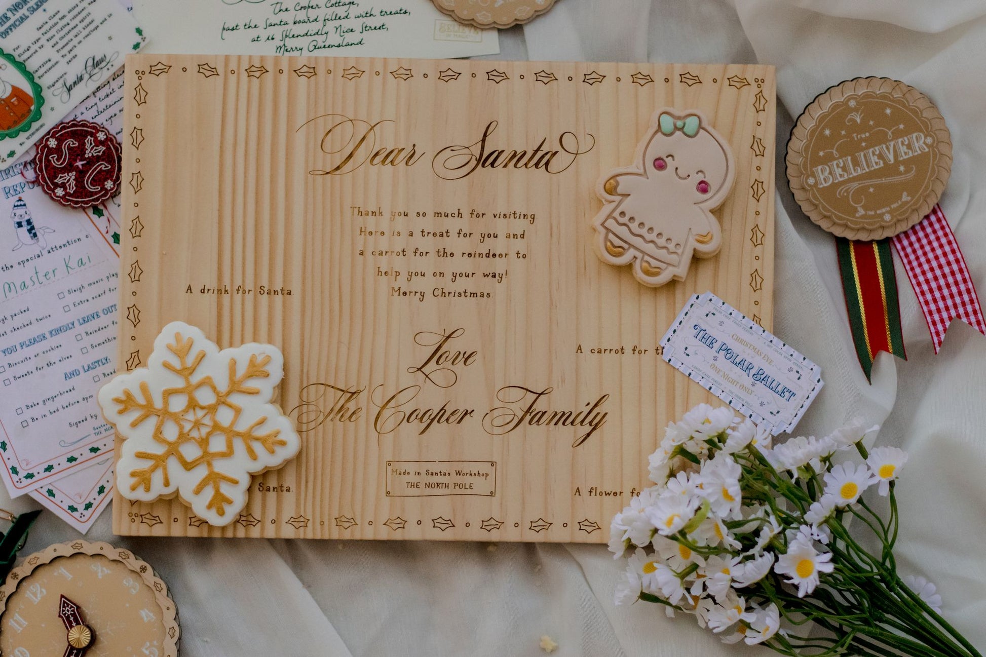 The perfect Santa board to place treats for the reindeer, flower for Mrs Claus and Santa himself on Christmas Eve. This Santa board is made from FSC pine and is personalised with your child or family name. You can also choose your board with the details on where to place items, or with just the message.