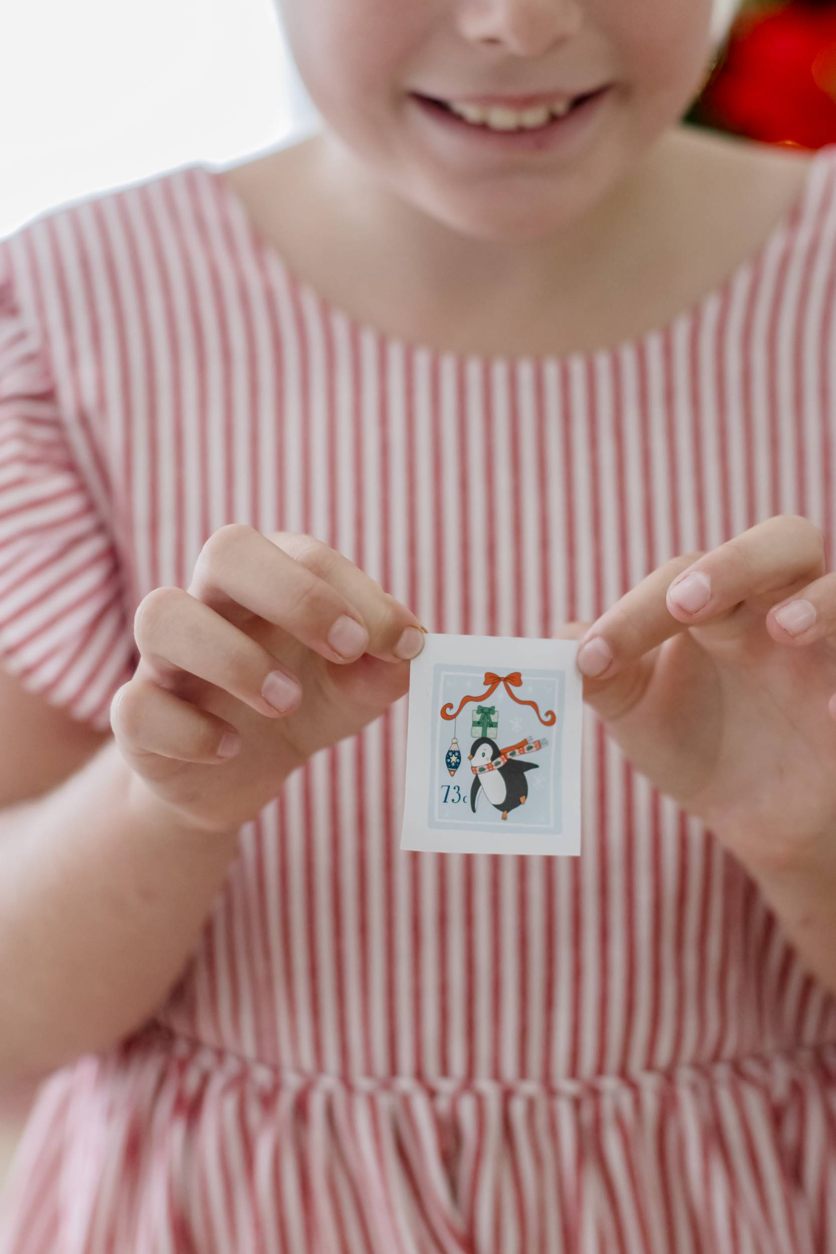 Some photos may picture previous year's Letter Writing Kit envelope. This year's kit comes with Rudolph & Penguin stamps.